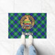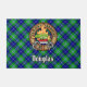 Clan Douglas crest badge surrounded by a strap and buckle over tartan background. Custom text.