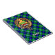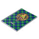 Clan Douglas crest badge surrounded by a strap and buckle over tartan background. Custom text.