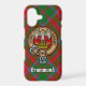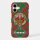 Clan Drummond crest badge surrounded by a strap and buckle over tartan background. Custom text.