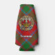 Clan Drummond crest badge surrounded by a strap and buckle over tartan background. Custom text.