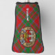 Clan Drummond crest badge surrounded by a strap and buckle over tartan background. Custom text.