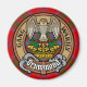 Clan Drummond crest badge surrounded by a strap and buckle over tartan background. Custom text.