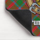 Clan Drummond crest badge surrounded by a strap and buckle over tartan background. Custom text.