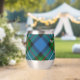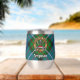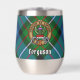 Clan Ferguson crest badge surrounded by a strap and buckle over tartan background. Custom text on both sides.