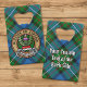 Clan Ferguson crest badge surrounded by a strap and buckle over tartan background. Custom text on both sides.