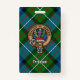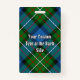 Clan Ferguson crest badge surrounded by a strap and buckle over tartan background. Custom text.