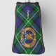 Clan Forbes crest badge surrounded by a strap and buckle over tartan background. Custom text.