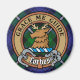 Clan Forbes crest badge surrounded by a strap and buckle over tartan background. Custom text.