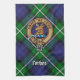 Clan Forbes crest badge surrounded by a strap and buckle over tartan background. Custom text.