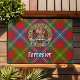 Clan Forrester crest badge surrounded by a strap and buckle over tartan background. Custom text.
