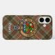 Clan Fraser crest badge surrounded by a strap and buckle over hunting weathered tartan background. Custom text.