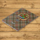 Clan Fraser crest badge surrounded by a strap and buckle over weathered hunting tartan background. Custom text.