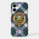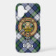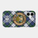 Clan Gordon crest badge surrounded by a strap and buckle over dress tartan background. Custom text.