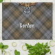 Clan Gordon crest badge surrounded by a strap and buckle over weathered tartan background. Custom text.