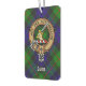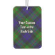 Clan Gunn crest badge surrounded by a strap and buckle over tartan background. Custom text on both sides.