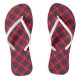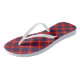 Flip flops with the Clan Hamilton tartan, a traditional Scottish plaid pattern in bright red and royal blue, with white accents.