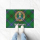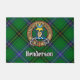 Clan Henderson crest badge surrounded by a strap and buckle over tartan background. Custom text.