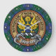 Clan Johnston crest badge surrounded by a strap and buckle over tartan background. Custom text.