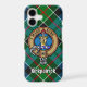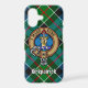Clan Kirkpatrick crest badge surrounded by a strap and buckle over tartan background. Custom text.