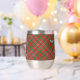 Clan MacAlister crest badge surrounded by a strap and buckle over tartan background. Custom text on both sides.