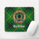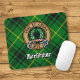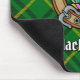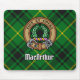 Clan MacArthur crest badge surrounded by a strap and buckle over tartan background. Custom text.