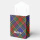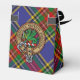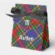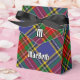 Clan MacBeth crest badge surrounded by a strap and buckle over tartan background. Custom text and monogram.