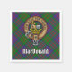 Clan MacDonald crest badge surrounded by a strap and buckle over tartan background. Custom text.