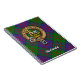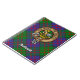 Clan MacDonald crest badge surrounded by a strap and buckle over tartan background. Custom text.