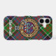 Clan MacDonald of Clanranald crest badge surrounded by a strap and buckle over tartan background. Custom text.