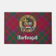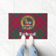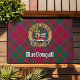 Clan MacDougall crest badge surrounded by a strap and buckle over tartan background. Custom text.