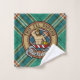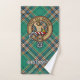 Clan MacFarlane crest badge surrounded by a strap and buckle over ancient hunting tartan background. Custom text on each towel.