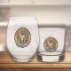 Clan MacFarlane crest badge surrounded by a strap and buckle over ancient hunting tartan background. Custom text on both sides.