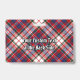 Clan MacFarlane crest badge surrounded by a strap and buckle over dress tartan background. Custom text on both sides.