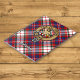 Clan MacFarlane crest badge surrounded by a strap and buckle over dress tartan background. Custom text.