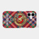 Clan MacFarlane crest badge surrounded by a strap and buckle over red tartan background. Custom text.