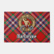 Clan MacFarlane crest badge surrounded by a strap and buckle over tartan background. Custom text.