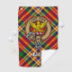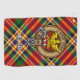 Clan MacGill crest badge surrounded by a strap and buckle over tartan background. Custom text.
