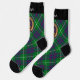 Clan MacIntyre crest badge surrounded by a strap and buckle over tartan background. Custom top stripe colour. Custom text on each sock.