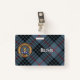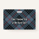 Clan MacKay crest badge surrounded by a strap and buckle over blue tartan background. Custom text on both sides.