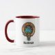 Clan MacKenzie crest badge surrounded by a strap and buckle over brown hunting tartan background. Custom text on both sides.