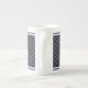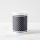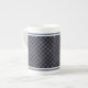 Bone china mug with the Mackenzie family weathered clan tartan pattern. Traditional Scottish reproduction plaid from 1778 in muted brown and blue, with black, red, and white accents.