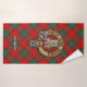 Clan MacLean crest badge surrounded by a strap and buckle over tartan background. Custom text on each towel.