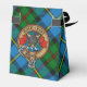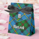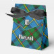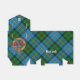 Clan MacLeod crest badge surrounded by a strap and buckle over green hunting tartan. Custom text and monogram.
