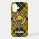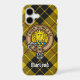 Clan MacLeod of Lewis crest badge surrounded by a strap and buckle over tartan background. Custom text.