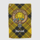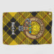 Clan MacLeod of Lewis crest badge surrounded by a strap and buckle over tartan background. Custom text.