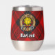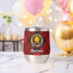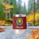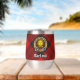 Clan MacLeod of Raasay crest badge surrounded by a strap and buckle over tartan background. Custom text on both sides.