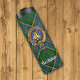 Clan MacMillan crest badge surrounded by a strap and buckle over hunting tartan background. Custom text.