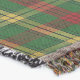 Colourful custom fringe end throw blanket made with graphics of the red, green, and yellow traditional Scottish clan MacMillan tartan plaid pattern. Khaki tan old world style text can be personalised to read what you want. Lovely gift idea for anyone.