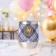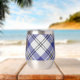 Clan MacPherson crest badge surrounded by a strap and buckle over blue dress tartan background. Custom text on both sides.