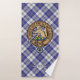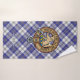 Clan MacPherson crest badge surrounded by a strap and buckle over blue dress tartan background. Custom text on each towel.